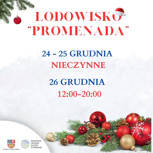 Godziny otwarcia lodowiska PROMENADA w Opatowie, w okresie świątecznym.2025.12.23Rozmiar tekstu:A-A+Udostępnij: