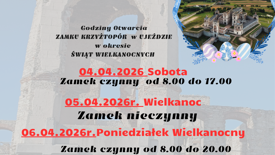 Godziny otwarcia Zamku Krzyżtopór w Ujeździe w okresie Świąt Wielkanocnych2026.03.27Rozmiar tekstu:A-A+Udostępnij: