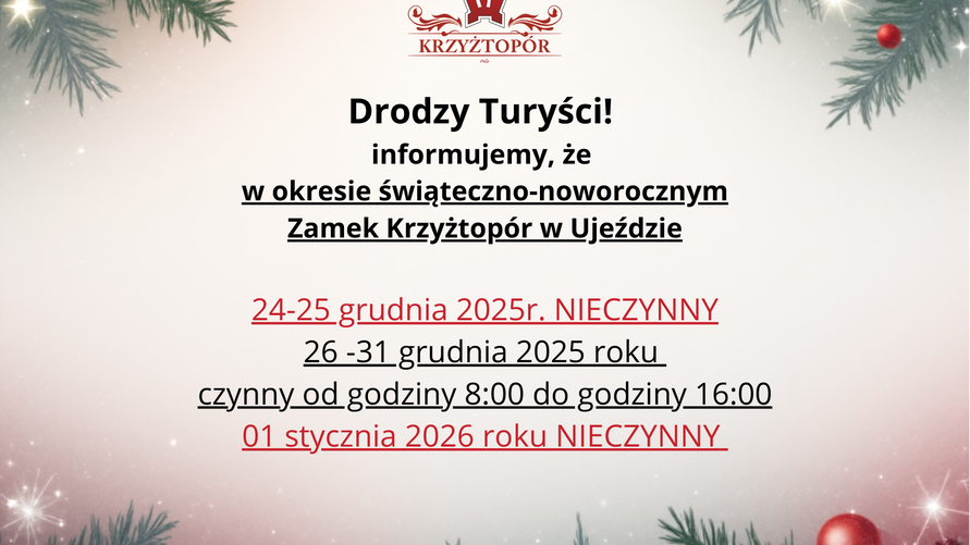 Godziny otwarcia Zamku Krzyżtopór w Ujeździe w okresie świątecznym2025.12.23Rozmiar tekstu:A-A+Udostępnij: